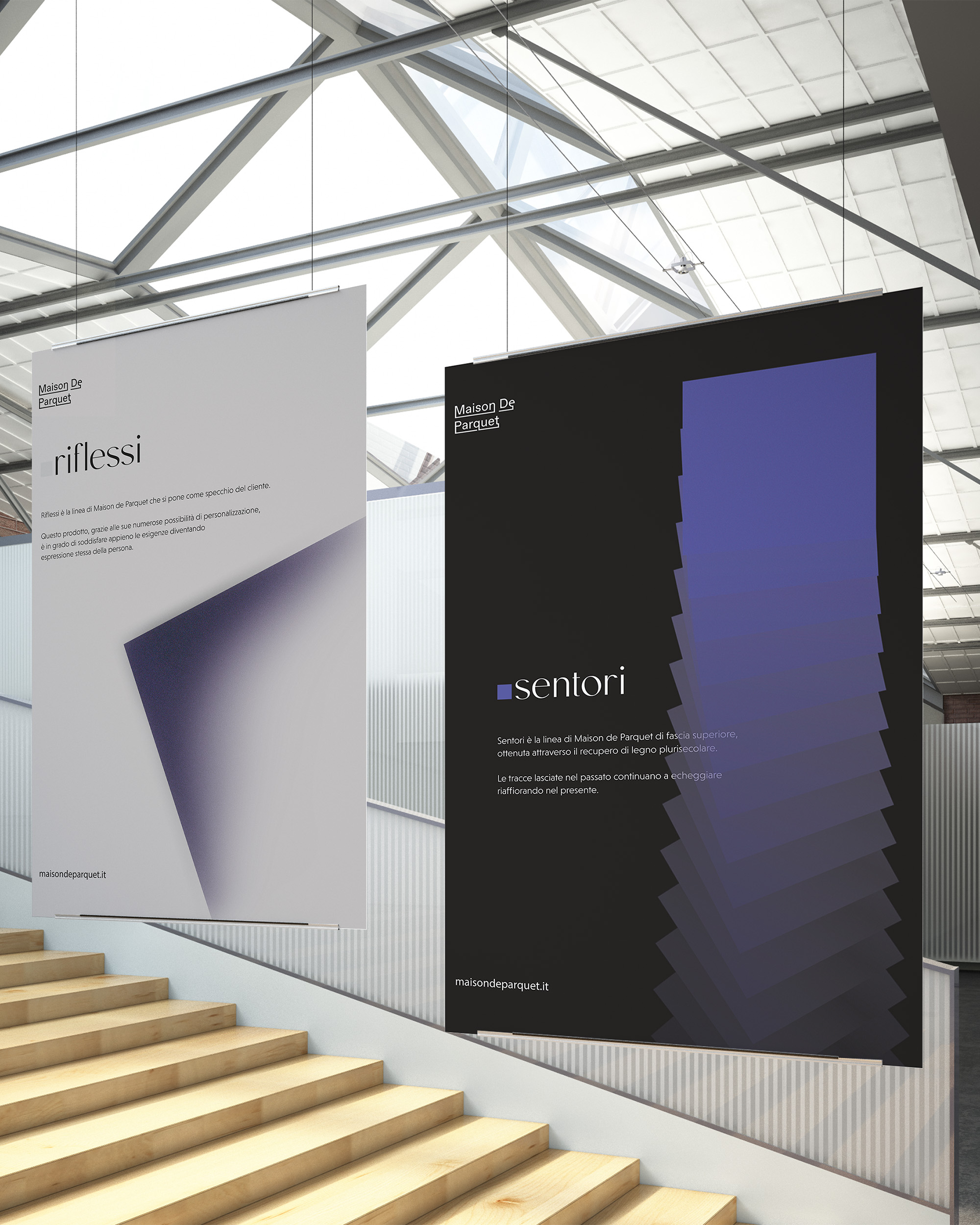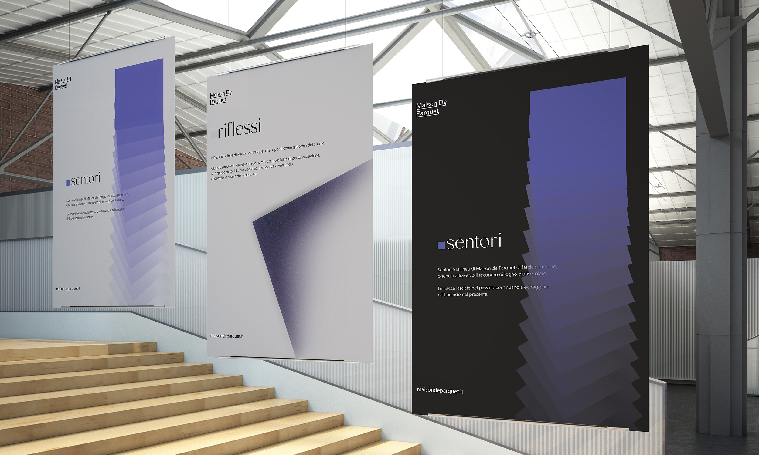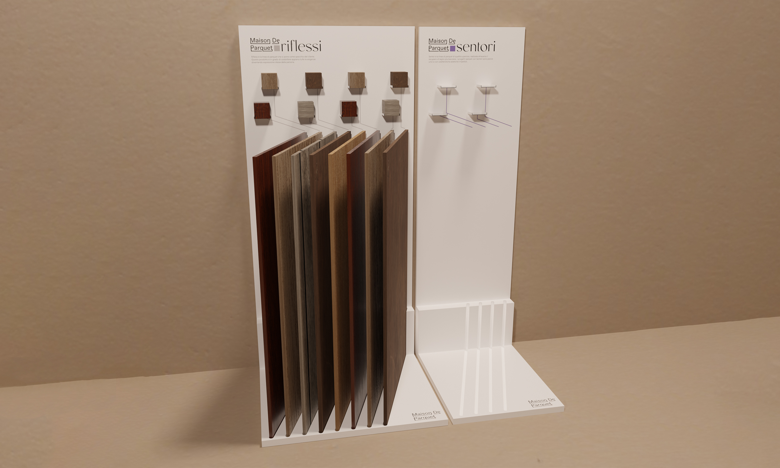 We found out that the company needed an iconic element, so we decided to adopt an unusual and risky choice: we chose to use purple for the luxury line and a greyscale for the standard line. The iconic graphic elements were the cube and the square which are recalled on the stand: some wooden cubes were present on this physical medium to introduce a new point of view and a new interaction, different from the usual stand system, which consists of wooden plates to put on the floor.